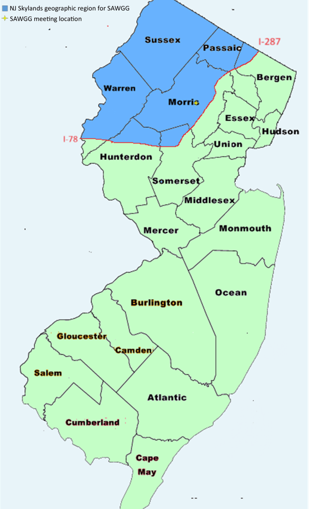 Since 2024, SAWGG membership is limited to adults residing within the arterial and physiographic boundaries of the New Jersey Skylands: the Highlands + remaining Sussex and Warren County towns. This border is generally where I-287 and I-78 were built upon, and conveniently forms SAWGG’s service or catchment area. More on about our unique cultural Region here.